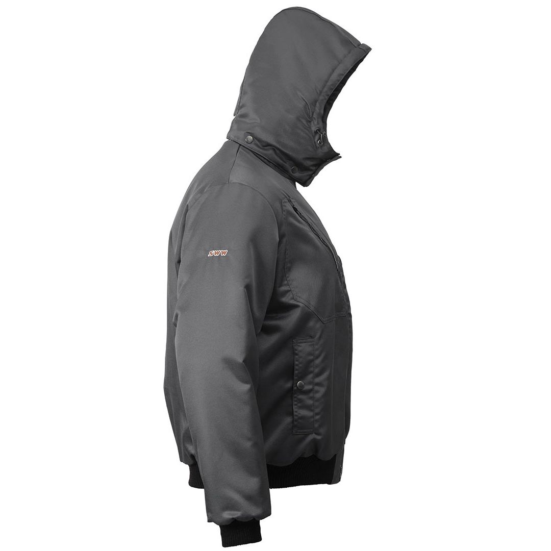 Зимняя укороченная куртка пилот (бомбер) 442KC-TWILL-55 на стеганой подкладке с утепленным отстегивающимся капюшоном. Восемь карманов, включая специальный карман на рукаве для телефона, воротник с искусственным мехом, трикотажная резинка на поясе и манжетах. Эту модель можно использовать на работе и для повседневной носки.